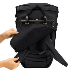 Ce bagage CityGo Bike 23 II passe facilement d'un mode d'utilisation à l'autre, sac à dos ou sacoche. Pour cela, Vaude utilise un système de zip sur la partie dorsale. Quand le zip est fermé, le rail avec les crochets QMR 2.0 et la sangle de maintien sont visibles (les crochets peuvent se fixer sur un tube latéral de porte-bagages de 8 à 16 mm de diamètre). Quand le zip est ouvert, vous pouvez glisser et cacher le rabat avec le système de fixation dans l'ouverture prévu au dos. Ce faisant, vous découvrez le système de portage dorsal, avec le panneau rembourré et les bretelles ErgoShape.