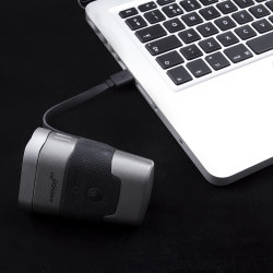 Ce phare VTT présente un super design, moderne et élégant, avec un boîtier en aluminium qui enferme 2 LEDs et une batterie au lithium-ion rechargeable via USB. Un témoin de charge est visible sur le dessus, où un petit bouton permet d'allumer/éteindre l'éclairage (pression prolongée) et de switcher entre les différents modes proposés (pression brève). Trois modes sont disponibles : Eco, Normal et Boost. Ce dernier offre une puissance maximale de 300 lumens, tandis que le mode Eco offre une autonomie très confortable de 16 heures.
