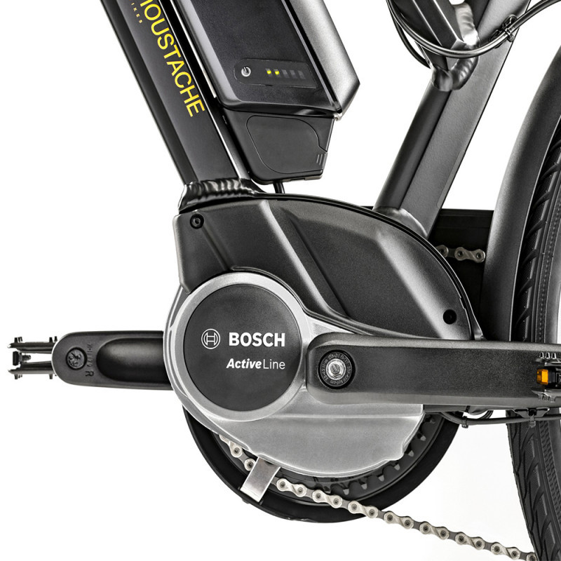 Le vélo Moustache Samedi 28.1 propose une assistance Bosch très fiable, avec le moteur Active Line et la commande déportée Purion. La batterie sur le tube diagonal a une capacité de 400 Wh. Grâce à ce système Bosch harmonieux, le vélo devient plus facile, très doux et encore plus plaisant !