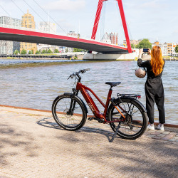 Issu de la gamme Dynamic O2feel, ce VAE offre une belle expérience de conduite, avec une dose de sportivité appréciable pour les pratiquant(e)s qui aiment vraiment rouler à vélo. Le cadre est renforcé, plus rigide, mais reste facile à vivre et à dompter, grâce à son design trapèze semi-ouvert. La position sur la selle, assez engagée, invite à pousser sur les pédales ! Le confort n'est pas oublié : vous profitez ici d'une fourche télescopique (débattement 80 mm), d'une tige de selle suspendue, d'une selle en gel. Les poignées sont faciles à prendre en main. L'inclinaison de la potence se règle avec un simple outil.