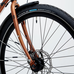 Le Ridgeback Expedition présente un style impeccable, qui retient l'attention dans ce nouveau coloris "copper". La fourche et le cadre présentent des lignes classiques remarquables. Ils utilisent un matériau de choix, de l'acier chromoly qui permet à ce vélo de durer longtemps, de supporter la charge, de rouler sur des routes difficiles en préservant au mieux le confort. Le cadre est composé avec des tubes en acier Reynolds 520 robustes. L'Expedition est configuré avec des roues 26 pouces, qui abaissent le centre de gravité - un bon point quand vous roulez avec des sacoches pleines.