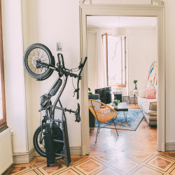 Le vélo cargo électrique Yuba FastRack se déplace et se range plus facilement en intérieur. Il prend l'ascenseur, navigue dans les couloirs étroits et se range discrètement dans un coin du bureau ou de l'appartement. Il suffit de le redresser en position verticale et de le faire avancer sur ses petites roulettes pour le manœuvrer jusqu'à son lieu de rangement. Avec le DRS rabattu, le guidon replié et la tige de selle télescopique enfoncée, le FastRack tient dans un espace "ridicule" d'un mètre carré !