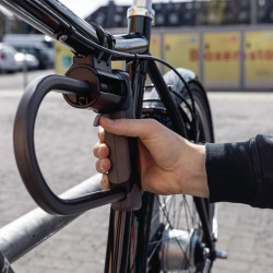 L'anse de l'antivol vient se loger dans l'ouverture, le support pivote et se verrouille automatiquement. Un levier pratique permet de libérer facilement l'antivol.
