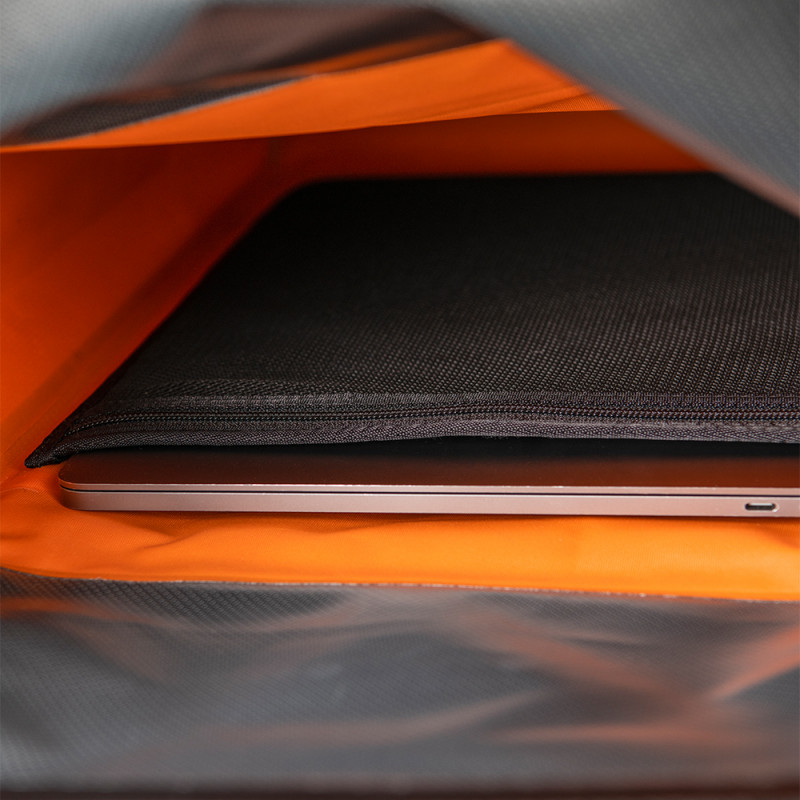 Le sac à dos Brompton Borough Waterproof propose un grand compartiment imperméable de 17 litres, protégé de la pluie par une fermeture enroulée-scratchée et des coutures soudées étanches. Vous avez une soupape d'évacuation d'air pour bien comprimer le sac. L'intérieur est organisé avec une grande poche mesh zippée et une poche ordinateur (écran 15" max). La doublure couleur orange permet de mettre les petits objets bien en évidence. La poche extérieure zippée (non étanche) est utile pour garder quelques "essentiels" à portée de main.