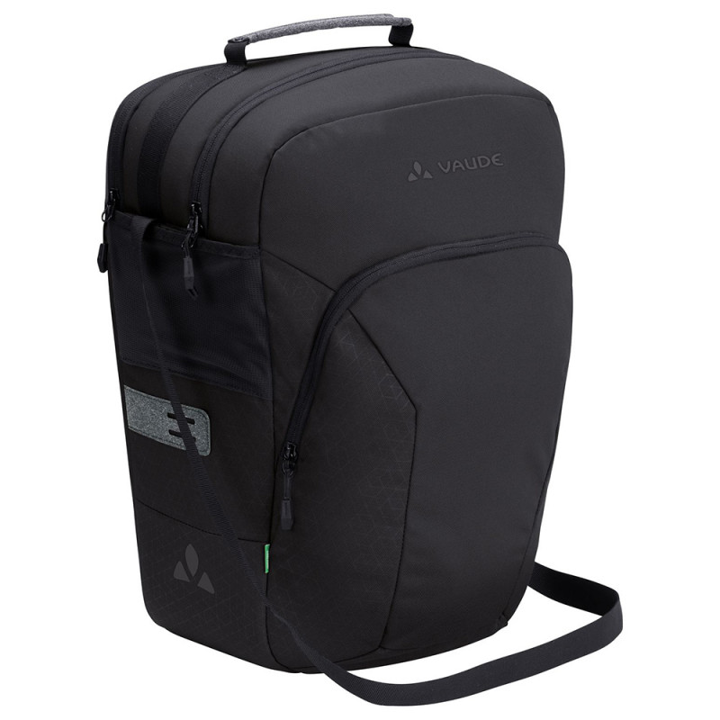 La sacoche arrière Vaude eBack utilise du matériau textile recyclé. Les toiles robustes à l'extérieur et la doublure sont tissées avec du fil polyester recyclé, obtenu grâce à la collecte et au retraitement de bouteilles plastiques usagées. Ainsi, la fabrication de cette sacoche pèse moins sur les ressources et maîtrise son impact sur le climat. Vaude applique un traitement déperlant écoresponsable (Eco Finish) et fournit une housse imperméable pour assurer la protection de vos affaires en cas de forte pluie. La sangle d'épaule est comprise. Des logos réfléchissants sont visibles sur les parois latérales, qui permettent aussi de clipser un éclairage de sécurité.