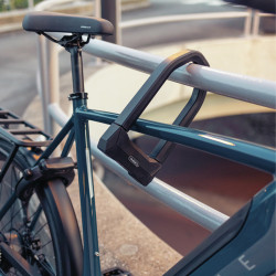 Cet antivol U Abus Granit Super Extreme 2500 utilise une anse parabolique de 27 mm, composée d'une épaisseur d'acier de 20 mm et d'un revêtement PVC de 7 mm. Il est livré avec une paire de clés et son support USH 2500, qui permet de le fixer au niveau du cadre ou du porte-bagages, pendant le trajet à vélo. Prévu pour protéger les vélos électriques les plus onéreux, ce puissant antivol bénéficie de nombreux labels de sécurité, en plus de l'évaluation Abus. Il reçoit notamment la certification Sold Secure niveau Diamond et l'homologation FUB 2 roues.