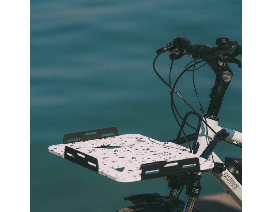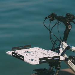 La plateforme Yuba Front Eco Deck est composée en plastique recyclé (en France). Elle est dotée de ridelles, trois rebords métalliques qui aident à caler le contenu. Vous avez surtout plusieurs ouvertures au niveau du plateau pour passer des sangles de fixation et maintenir solidement le chargement, qui peut être une caisse, un sac de courses, un colis, les cartables des enfants, etc.
