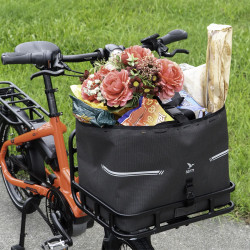 Ce sac avant Tern WeatherTop Bag possède un formidable gabarit, avec un volume de 45 litres ajustable. Vous pouvez l'utiliser de deux manières, en mode fermé étanche avec la partie supérieure fermement enroulée, ou en mode bucket ouvert, avec la partie à enrouler qui se rabat contre les parois intérieures. Le WeatherTop Bag en mode bucket peut se remplir à ras bord avec toutes les courses de la semaine, ou recevoir un objet volumineux comme un pot de fleur, qui peut dépasser du bord. Équipé de 2 longues anses, ce sac se porte à la main ou à l'épaule. Il intègre une poche intérieure zippée bien pratique.