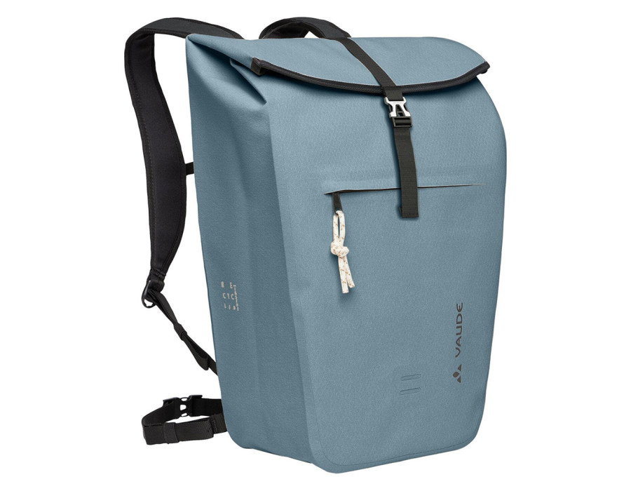 Le sac à dos Vaude Clubride Urban 25L protège bien vos affaires sous son rabat replié étanche. Le tissu principal mélange du polyamide recyclé (58%) et du polyester recyclé (42%), avec un bel aspect "Subtile Diamond" en surface. Cette composition à base de matériau recyclé permet à Vaude de redonner vie à des bouteilles PET et des filets de pêche pour la partie PA (ou des tapis usagés). Le fabricant précise également que le PVC est exclu du processus d'imperméabilisation. Le revêtement imperméable est à base de PU et TPU. Les coutures sont soudées par ultrasons. Le panneau dorsal Vent Comfort offre un rembourrage appréciable et une belle stabilité. Vous disposez de sangles amovibles sur la poitrine et à la ceinture.