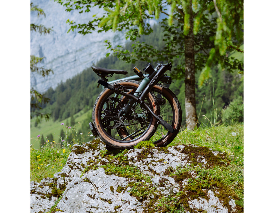 Le vélo pliant Brompton G Line reçoit des composants sur mesure. Les nouvelles roues 20" montent les solides pneus gravel Schwalbe G-One Allround, qui peuvent s'installer sans chambre à air (montage Tubeless Ready).