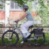 Le kit accessoires est super complet. Moustache fournit la plus grande partie des éléments, la béquille, les garde-boue et le porte-bagages. Il faut préciser que ce porte-bagages est déjà équipé des points de fixation QL3 pour vos sacoches latérales Ortlieb ; son rack MIK HD reçoit n'importe quel bagage, panier ou porte-bébé monté sur un adaptateur MIK. Branchés sur la batterie Bosch de 500 Wh, les éclairages sont signés Axa (phare avant 30 lux) et Spanninga (feu arrière). Vous retrouvez aussi l'antivol de cadre Axa Block XXL, qui partage la même clé que le verrou de batterie.