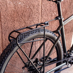 Ce porte bagage a équipé un vélo qui n'est pas muni de supports de fixation de porte bagages sur le cadre. Comme c'est un cadre en carbone, je ne peux pas me fixer sur les haubans. Il a donc fallu utiliser un axe traversant Ortlieb spécifique. Ce porte-bagages a complètement rempli son rôle pendant toute la Race Across France. Stable, solide, plutôt léger.