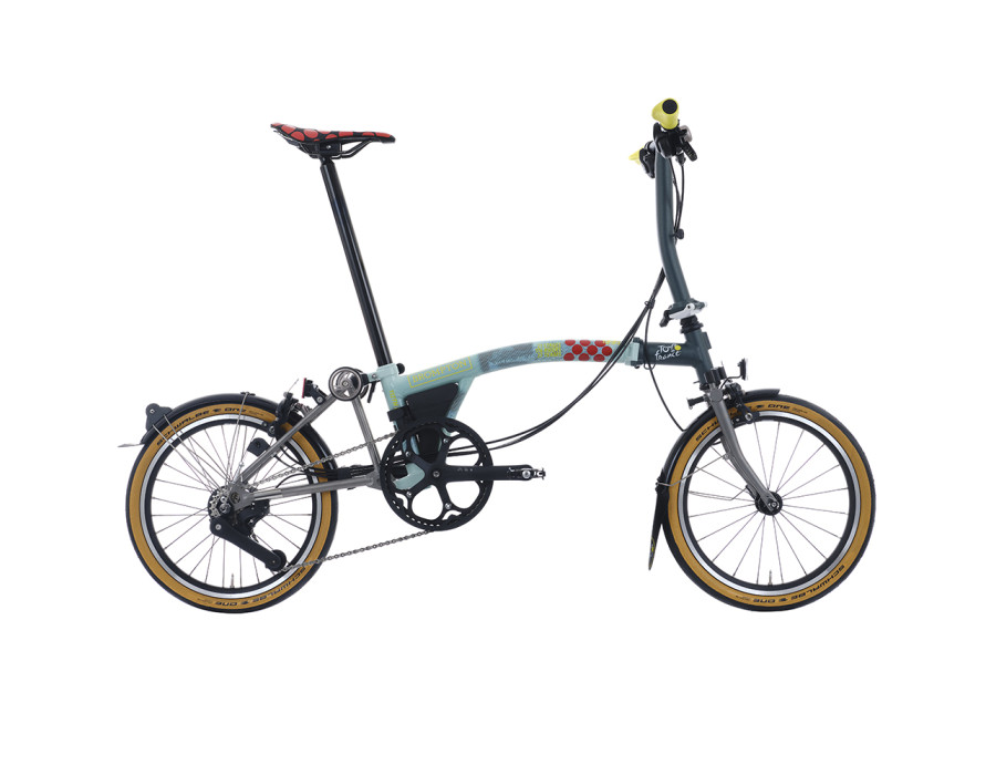 Un Brompton performant en acier/titane, dans l'ambiance du Tour de France, aux couleurs des maillots distinctifs. + de détails