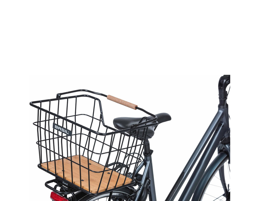 Ce modèle Nordland est fidèle à la philosophie de Basil, qui aime bien proposer des accessoires vélo au style soigné. Ce panier élégant présente une structure aérienne en acier et une base en bambou. On n'oublie pas la anse, avec sa poignée Soft Grip en caoutchouc/liège. La partie métallique, peinte en noir, se marie bien avec la couleur naturelle du bois. Le volume de rangement (23L) suffit pour les courses alimentaires de routine. Vous pouvez placer un tote bag ou votre sac à main à l'intérieur.