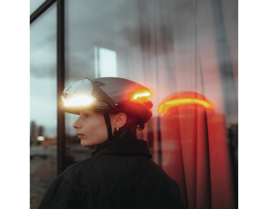 Le meilleur casque vélo urbain Abus. Une visibilité à 360°, des clignotants, un feu stop et des cache-oreilles. + de détails