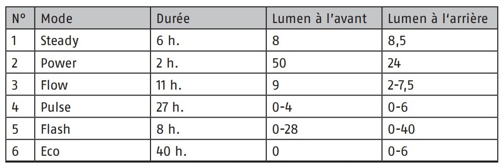 6 modes (Steady / Power / Flow / Pulse / Flash / Eco), fonction clignotant, recharge USB-C