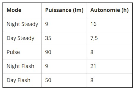 Le boîtier est légèrement courbé, pour élargir l'angle de diffusion à 220°. L'éclairage utilise des LED COB dernière génération. Elles forment un anneau brillant qui entoure un réflecteur super efficace. Overade annonce un pic de puissance de 90 lumens en mode Pulse et une autonomie max de 21 heures en mode Night Flash. Il y a 5 modes d'éclairage au choix, avec un bouton pratique pour switcher (au niveau du logo). La batterie se recharge avec le câble USB fourni.