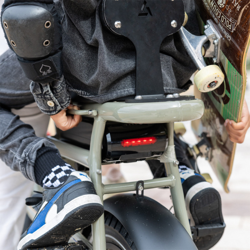 - Plateforme arrière pour fixer un porte-bébé ou une caisse derrière le passager (max 25 kg)