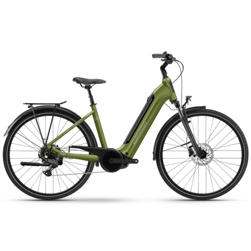 Ce VTC électrique Winora Tria X9 est dispo en gris brillant ou vert brillant, avec 5 tailles au choix.