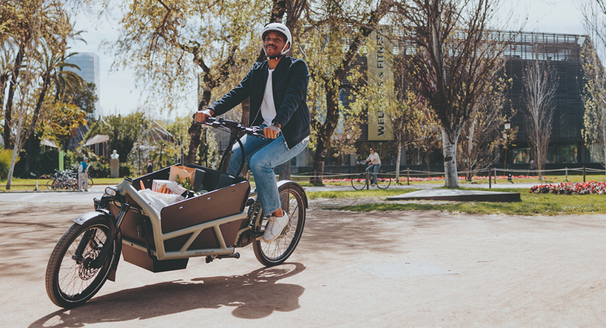 Un homme aux commandes d'un biporteur équipé du système de freinage ABS Bosch décrit un virage dans un parc urbain avec des provisions dans sa caisse avant.