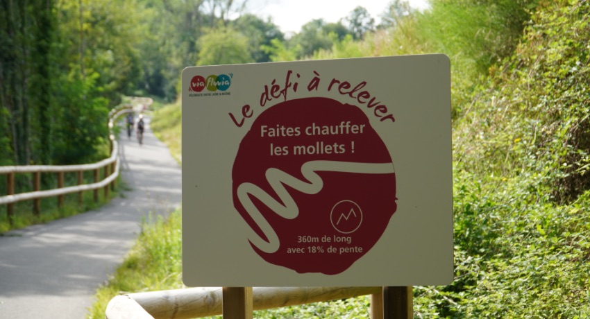 Une dizaine de kilomètres plus loin, aux environs de Bourg-Argental, se dresse un obstacle d’une toute autre ampleur, un mur de 360 mètres dont la déclivité oscille entre 15 et 18 %. L’épouvantail de la Via Fluvia ! Au pied de ce raidard aux lacets resserrés, un panneau indique les mensurations de la pente et encourage les cyclistes qui s’engagent dans l’ascension. Avec un vélo traditionnel, nombreux sont ceux qui poussent. Mais en VAE, même lesté de volumineuses sacoches, on parvient à se hisser au sommet sans que la montée ne tourne au tour de force. La voie ferrée originelle filait dans un tunnel malheureusement inaccessible aujourd’hui.
