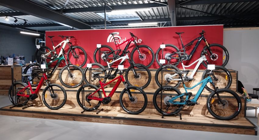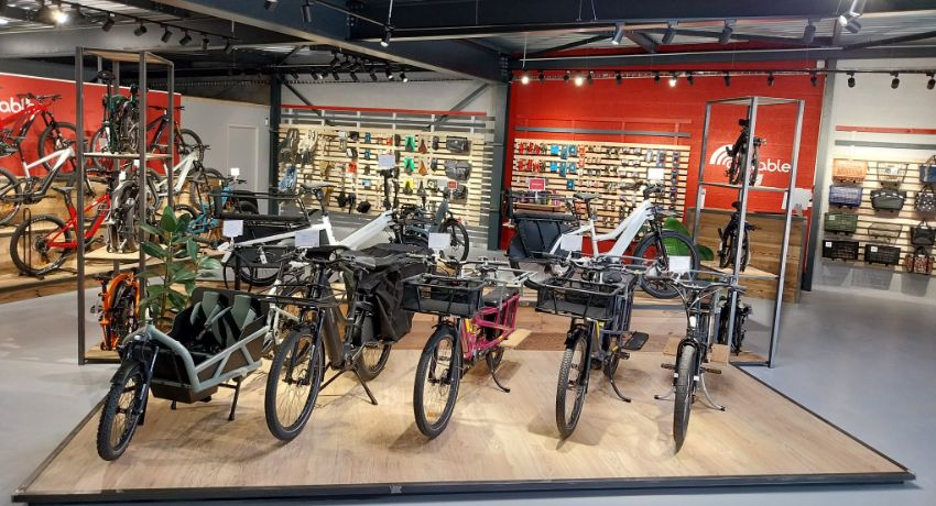 Aménagé dans un local de 300 m², le magasin s’articule autour d’un vaste espace de vente où se côtoient, sur des podiums en bois et métal, les différents univers de l’établissement : VAE urbain, VTC, pliants, gravel, cargos, VTTAE…